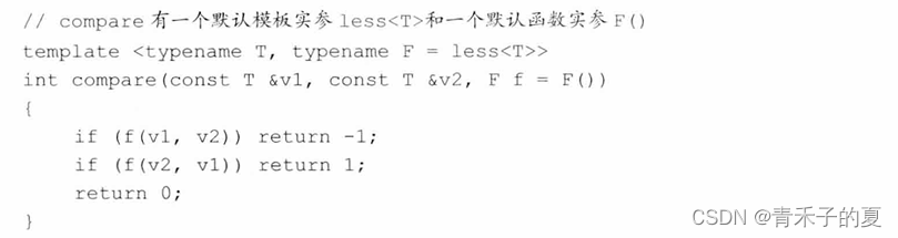 默认模板实参指出compare将使用标准库的less函数对象类,它是使用与compare一样的类型参数实例化的。默认函数实参指出f将是类型F的一个默认初始化的对象。