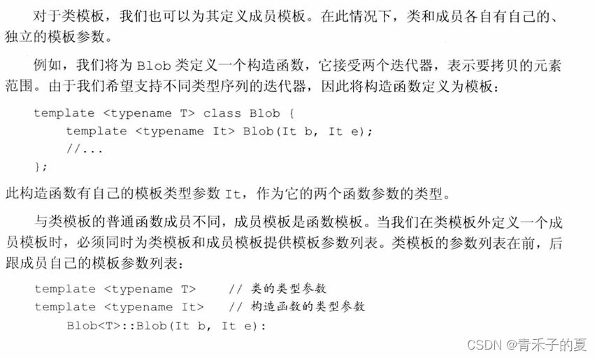 一个类(无论是普通类还是类模板)可以包含本身是模板的成员函数。这种成员被称为成员模板(member template)。成员模板不能是虚函数。