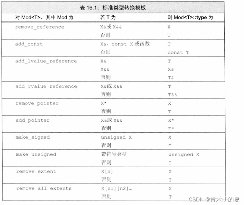 标准库的类型转换(type transformation)模板定义在头文件type_trait中。这个头文件中的类通常用于所谓的模板元程序设计。
