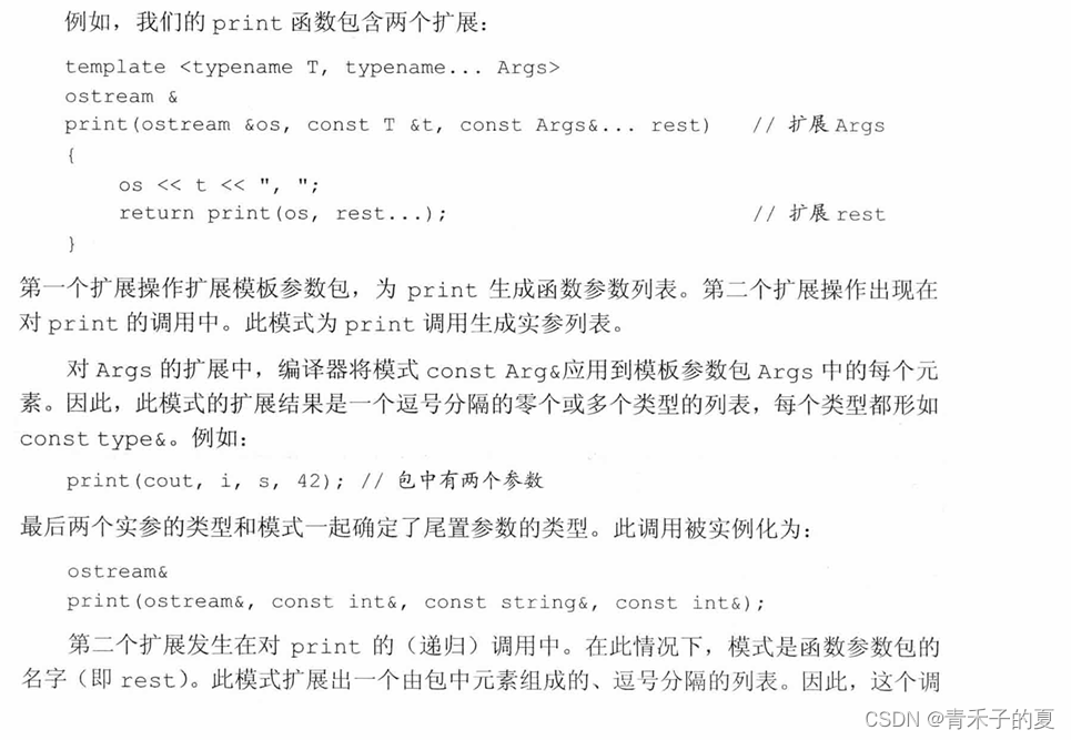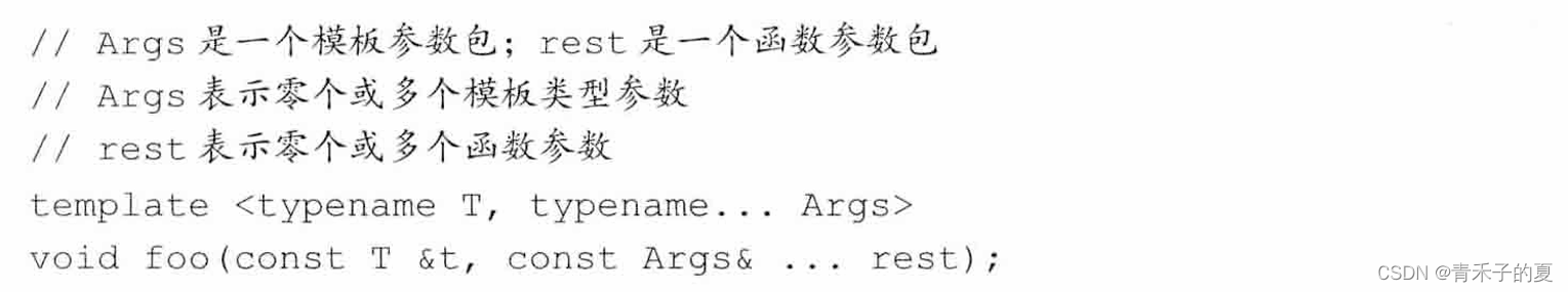 我们用一个省略号来指出一个模板参数或函数参数表示一个包。再一个模板参数列表中,class...或typename...指出接下来的参数表示零个或多个类型的列表;一个类型名后面跟一个省略号表示零个或多个给定类型的非类型参数的列表。在函数参数列表中,如果一个参数的类型是一个模板参数包,则此参数也是一个函数参数包。