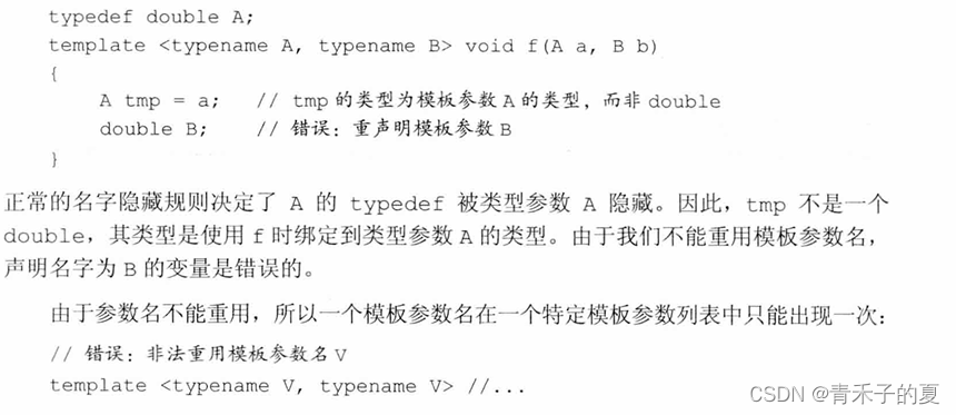 模板参数遵循普通的作用域规则。但与大多数其他上下文不同,在模板内不能重用模板参数名。