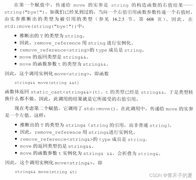 move的函数参数T&&是一个指向模板类型参数的右值引用。通过引用折叠,此参数可以与任何类型的实参匹配。特别地,我们既可以传递给move一个左值,也可以传递给它一个右值: