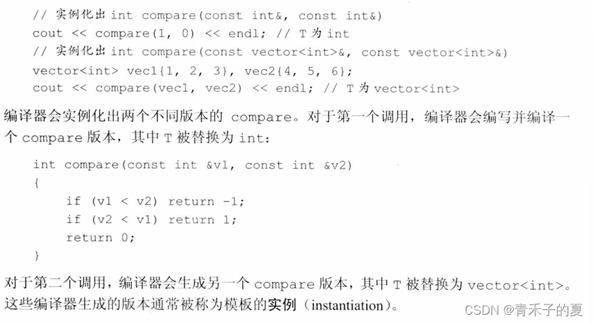 编译器用推断出地模板参数来为我们实例化(instantiate)一个特定版本的函数。当编译器实例化一个模板时,它使用实际的模板实参代替对应的模板参数来创建出模板的一个新“实例”。