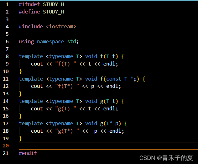 模板定义以关键字template开始,后跟一个模板参数列表(template parameter list),这是一个逗号分隔的一个或多个模板参数的列表,用小于号(<)和大于号(>)包围起来。