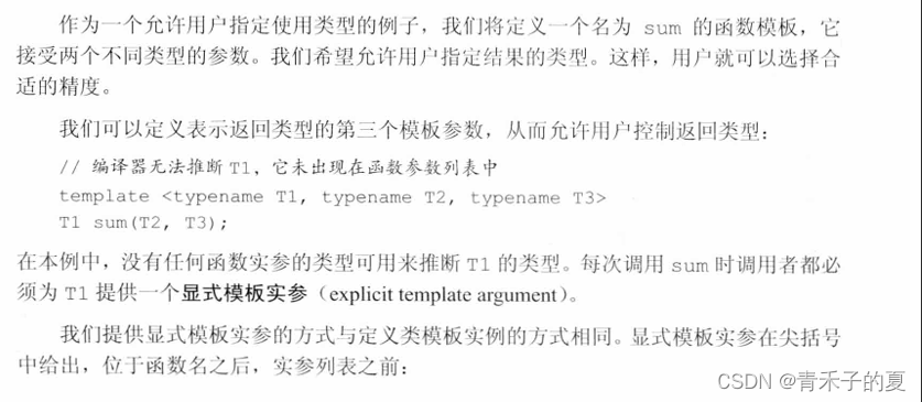 在某些情况下,编译器无法推断出模板实参的类型。其他一些情况下,我们希望允许用户控制模板实例化。当函数返回类型与参数列表中任何类型都不相同时,这两种情况最常出现。