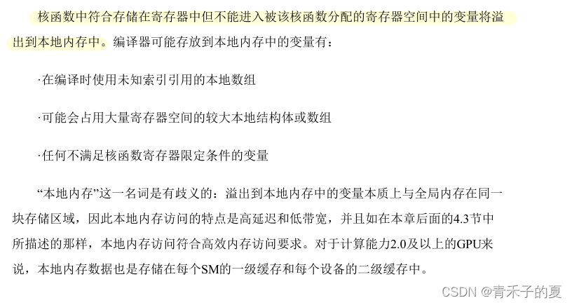 如果一个核函数使用了超过硬件限制数量的寄存器,则会用本地内存替代多占用的寄存器。这种寄存器溢出会给性能带来不利影响。nvcc编译器使用启发式策略来最小化寄存器的使用,以避免寄存器溢出。