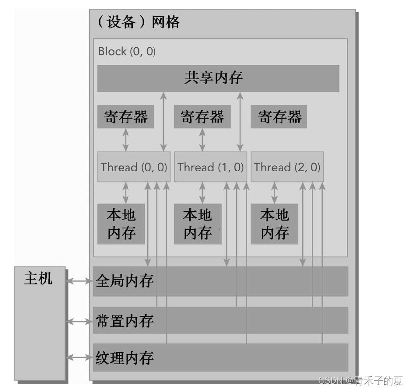 CUDA内存模型提出了多种可编程内存的类型:寄存器、共享内存、本地内存、常量内存、纹理内存、全局内存。