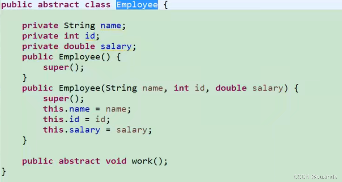 编写一个Employee类,声明为抽象类,包含如下三个属性:name,id, salary。提供必要的构造器和抽象方法:work()