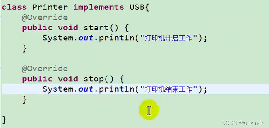 另一方面,有时必须从几个类中抽取出一些共同的行为特征,而它们之间又没有is-a的关系,仅仅是具有相同的行为特征而已。例如:鼠标、键盘、打印机、扫描仪、摄像头、充电器、MP3机、手机、数码相机、移动硬盘等都支持USB连接。