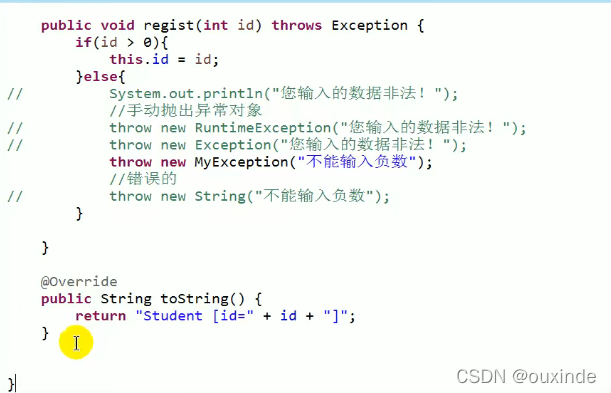 在程序执行中,除了自动抛出异常对象的情况之外,我们还可以手动的throw一个异常类的对象。