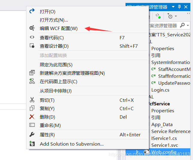运行好了以后就去WcfService下面的Web.config那里右键编辑WCF配置