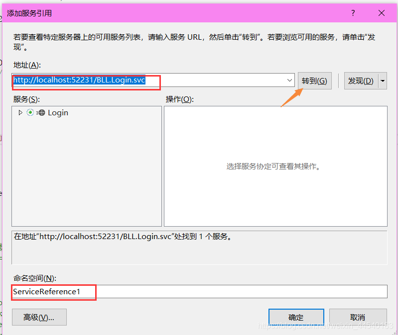 服务引用里面的地址就是刚刚服务端运行的路径地址全部复制过来,然后点击转到看看能不能转到成功,服务端运行不能停止,不然就找不到那个路径,再然后就是给新的服务引用命个名称就可以了。