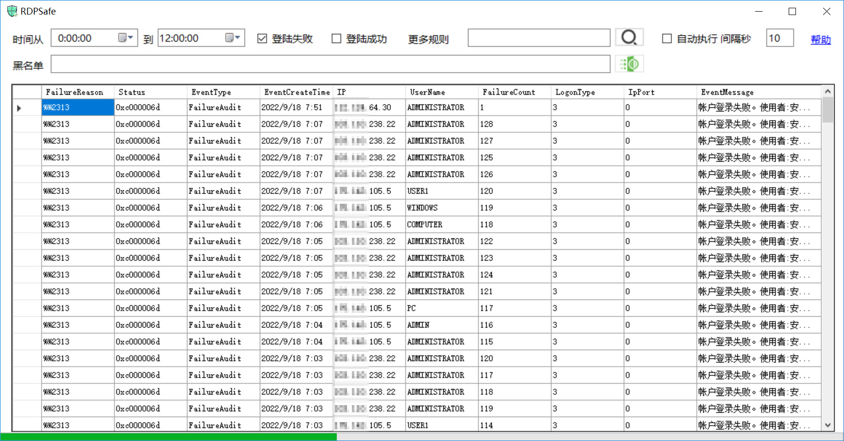 统计一段期间内(通常是一天),同一IP地址验证密码次数,超过设定的阀值,就把这个IP加入黑名单,用Windows系统防火墙拦截此IP继续连接验证密码。