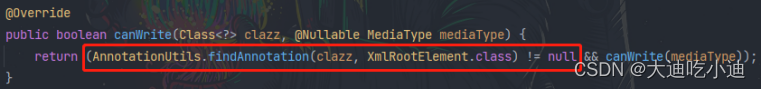 (4)Jaxb2RootElementHttpMessageConverter的supports逻辑直接写在canWrite方法中,仅支持对带@XmlRootElement注解的对象进行转换: