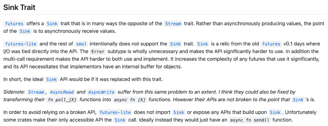 其三是 Mea 的 mpsc 实现跟 futures-rs 里的 Sink trait 不是很兼容。关于 Sink trait 的吐槽如果我提到 Async Rust 的接口设计和 combinator 的时候,可能会做一个详细的展开,但是这里我可以援引前 async-std 团队在 futures-lite 库里的一个锐评: