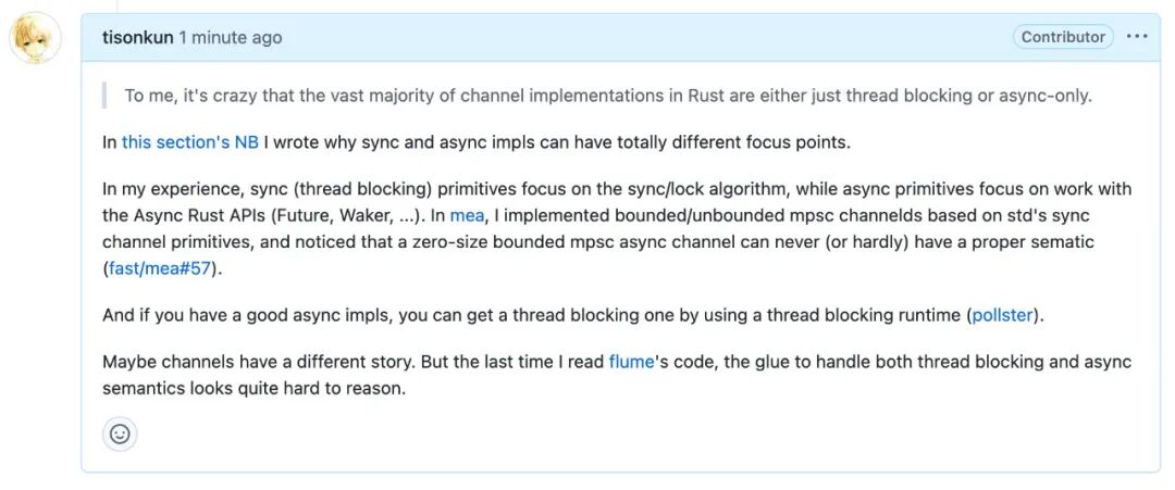 其一是在包装 std 的 mpsc 时,我需要一个跟 AtomicWaker 类似的能力,以在 send 成功时唤醒潜在等待的 recv 调用。本来我想直接用 atomic-waker 库,而且我想他们是不是可以进标准库,可是 @taiki-e 老哥突然自爆说他觉得 atomic-waker 不行[13],搞得我也有点尴尬。你说直接用吧,其实没啥问题,但是就让人忍不住想找找看有没有别的替代,于是找到了 atomicbox[14] 这个库。但是 atomicbox 好像不维护了,在接口上也有一些问题,我于是把它拿到了 Mea 里维护起来,主要是为了 mpsc 使用,但是也不妨作为公开的原语发布。这里还有一些跟内存屏障和原子操作相关的问题[15],有待后续优化。