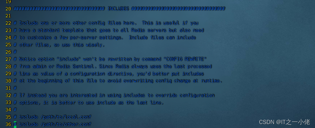 Redis只有一个配置文件,如果多个人进行开发维护,那么就需要多个这样的配置文件,这时候多个配置文件就可以在此通过 include /path/to/local.conf 配置进来,而原本的 redis.conf 配置文件就作为一个总闸。