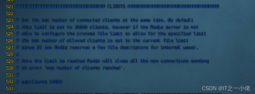- maxclients :设置客户端最大并发连接数,默认无限制,Redis可以同时打开的客户端连接数为Redis进程可以打开的最大文件。 描述符数-32(redis server自身会使用一些),如果设置maxclients为0 。表示不作限制。当客户端连接数到达限制时,Redis会关闭新的连接并向客户端返回max number of clients reached错误信息