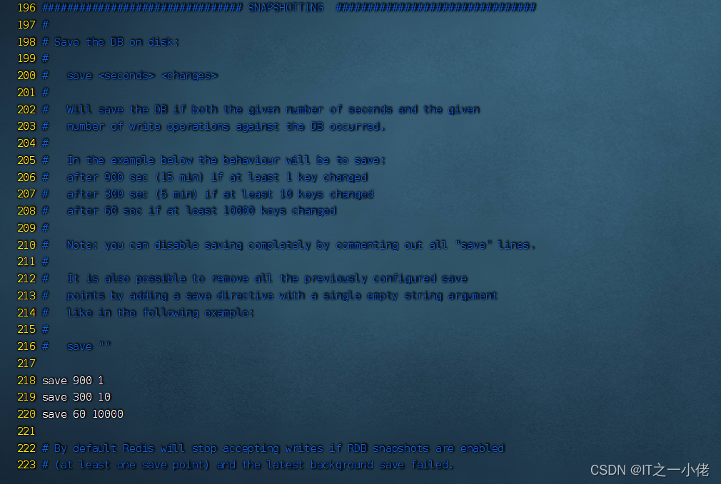 - save:这里是用来配置触发 Redis的持久化条件,也就是什么时候将内存中的数据保存到硬盘