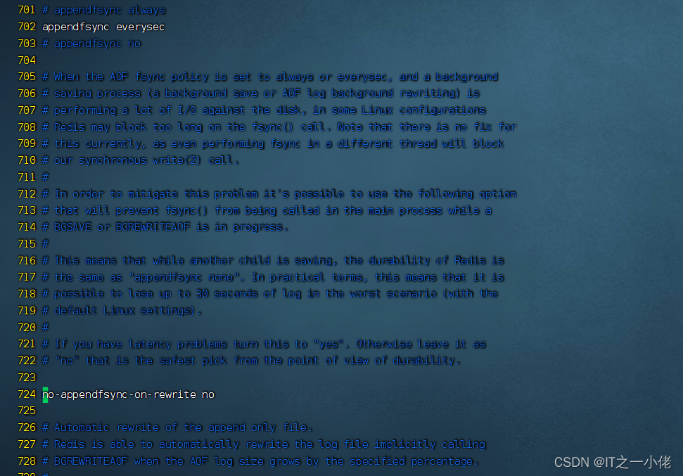 appendfsync:aof持久化策略的配置;no表示不执行fsync,由操作系统保证数据同步到磁盘,速度最快;always表示每次写入都执行fsync,以保证数据同步到磁盘;everysec表示每秒执行一次fsync,可能会导致丢失这1s数据