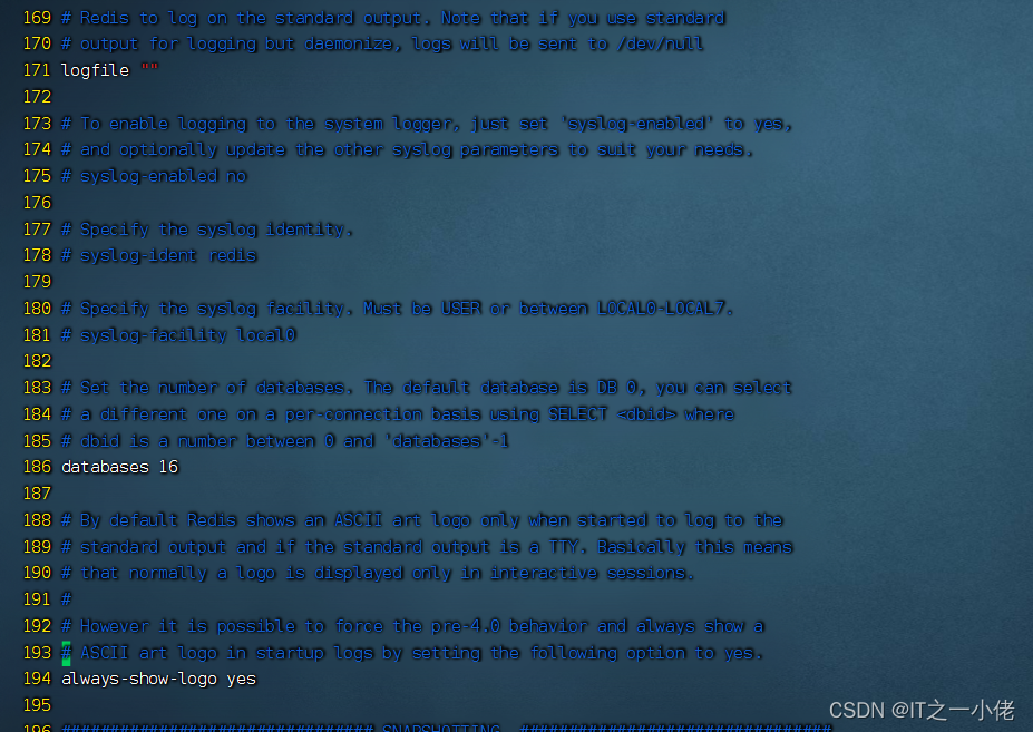 databases:设置数据库的数目。默认的数据库是DB 0 ,可以在每个连接上使用select 命令选择一个不同的数据库,dbid是一个介于0到databases - 1 之间的数值。默认值是 16,也就是说默认Redis有16个数据库。