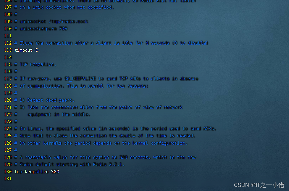 - tcp-keepalive :单位是秒,表示将周期性的使用SO_KEEPALIVE检测客户端是否还处于健康状态,避免服务器一直阻塞,官方给出的建议值是300s,如果设置为0,则不会周期性的检测。
