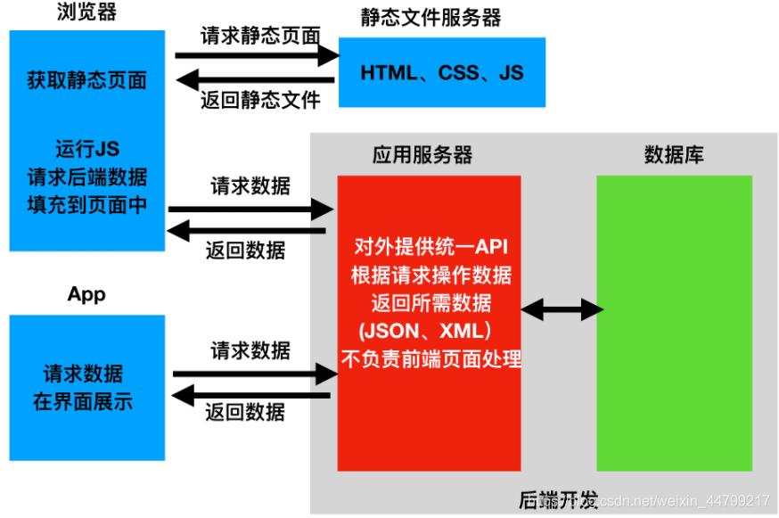 在前后端分离的应用模式中,后端仅返回前端所需的数据,不再渲染HTML页面,不再控制前端的效果。至于前端用户看到什么效果,从后端请求的数据如何加载到前端中,都由前端自己决定,网页有网页的处理方式,App有App的处理方式,但无论哪种前端,所需的数据基本相同,后端仅需开发一套逻辑对外提供数据即可。