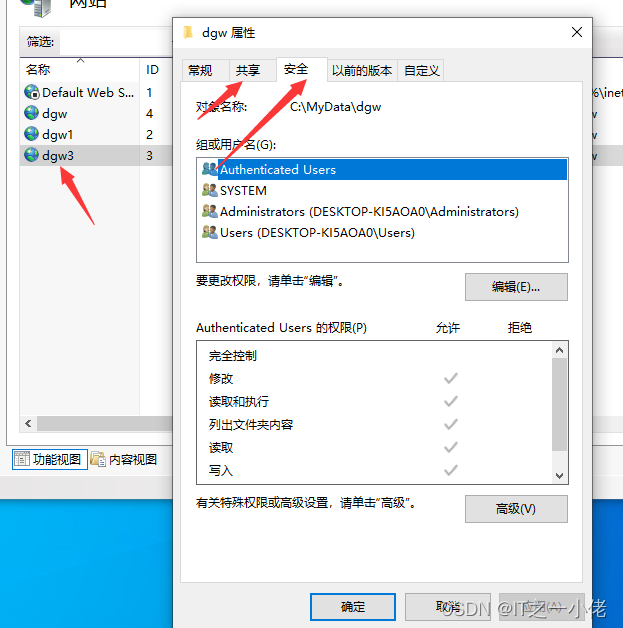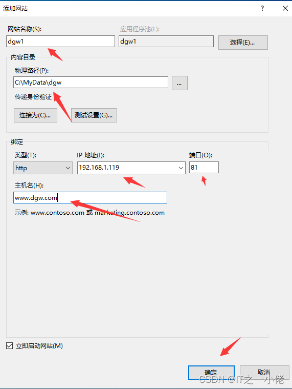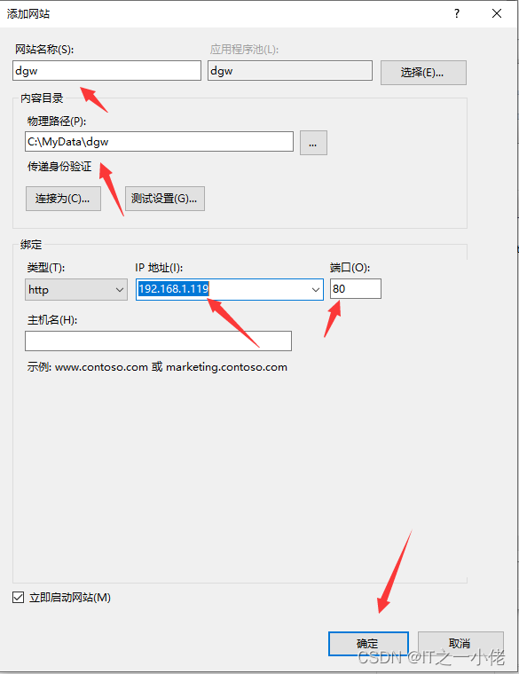 4)新建网站-地址端口绑定-指定站点路径-设置权限