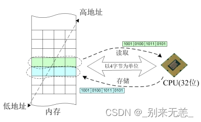 CPU字长确定之后,相当于明确了系统每次存取内存数据时的边界,以32位系统为例,32位意味着CPU每次存取都以4字节为边界,因此每4字节可以认为是CPU存取内存数据的一个单元。