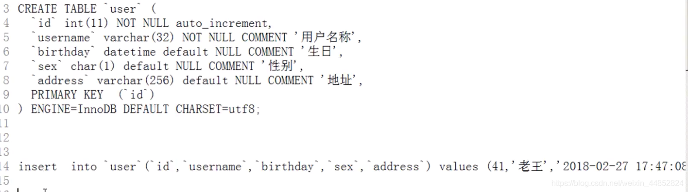 insert into `user` (`id`,`username`,`birthday`,`sex`,`adress`)VALUES(41,'老王', '2018-02-27','男','麻布新村')