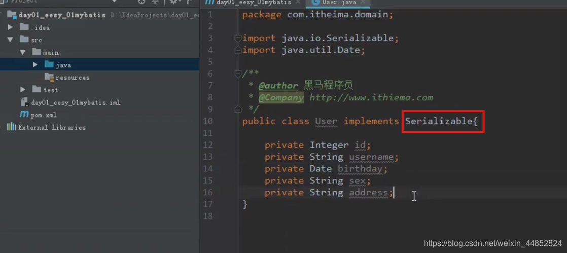 5.创建一个实体类,与数据库中表对应的实体类,同时实现序列化接口,还有生成get,set方法,和tostring方法。