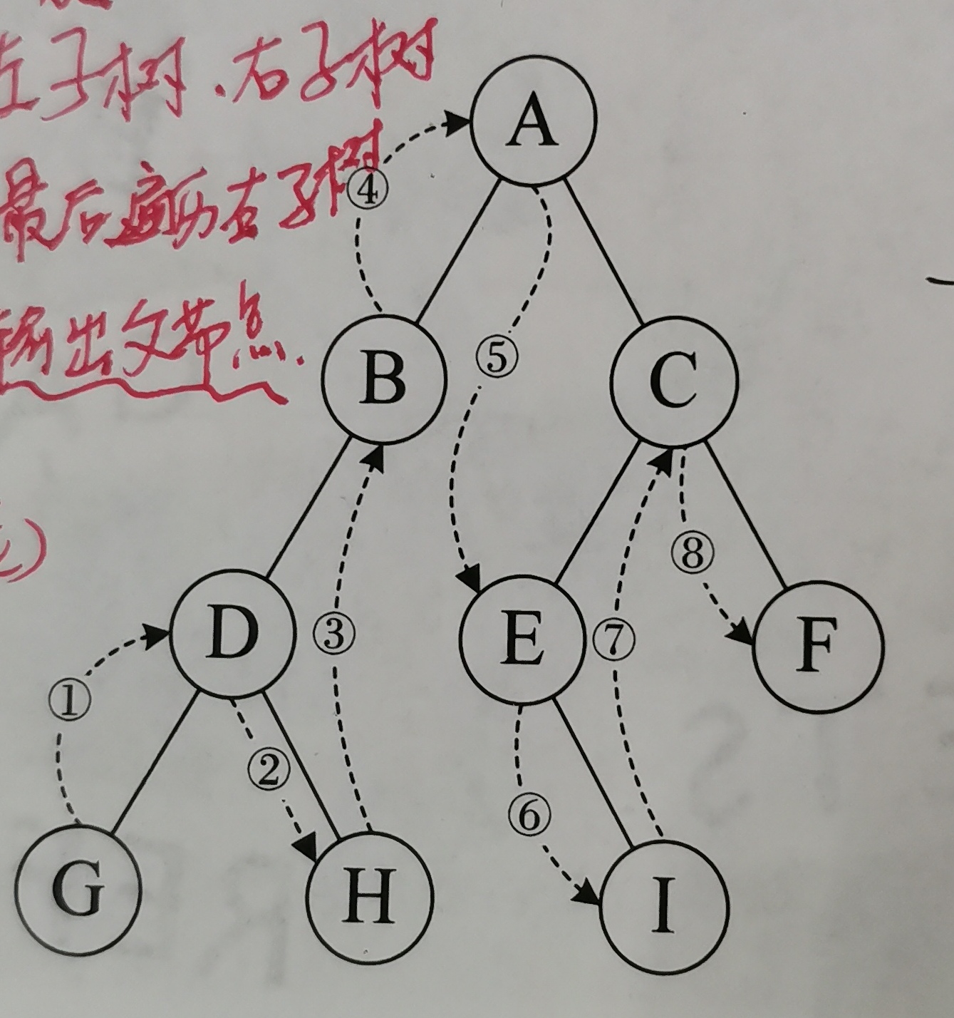 原因:先访问【A】;再访问A左,是【B】;再访问B左,是【D】;再访问D左,是空,则返回到【D】;再访问D右,是空,则返回到【D】;返回到【B】;访问B右,是【E】;访问E左,是空,则返回到【E】;访问E右,是空,则返回到【E】;返回到【B】;再返回到【A】;访问A右,是【C】;访问C左,是【F】;访问F左,是空,则返回到【F】;访问F右,是空,则返回到【F】;返回到【C】;访问C右,是【G】;访问G左,是空,则返回到【G】;再访问G右,是空,则返回到【G】;返回到【C】;返回到【A】;