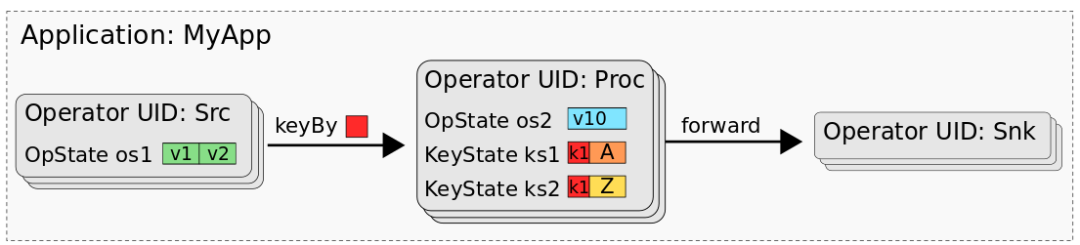 下图显示的应用程序“MyApp”,由称为“Src”,“Proc”和“Snk”的三个算子组成。Src 具有一个 operator state(os1),Proc 具有一个 operator state(os2)和两个 keyed state(ks1,ks2),而 Snk 则是无状态的。