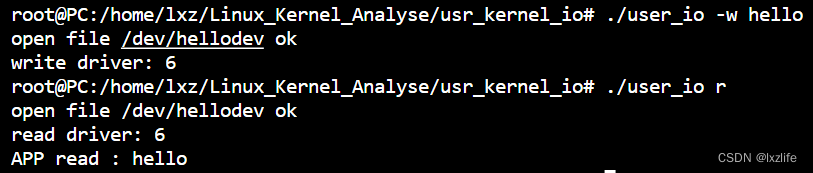 该文章展示了一个简单的Linux内核模块,创建了一个设备驱动,该驱动注册了一个字符设备并实现了读写操作。用户空间应用通过打开/dev/hellodev文件进行通信,实现数据的读写。内核模块通过`module_init`和`module_exit`宏注册初始化和退出函数,而用户应用程序则通过标准I/O函数与驱动交互。