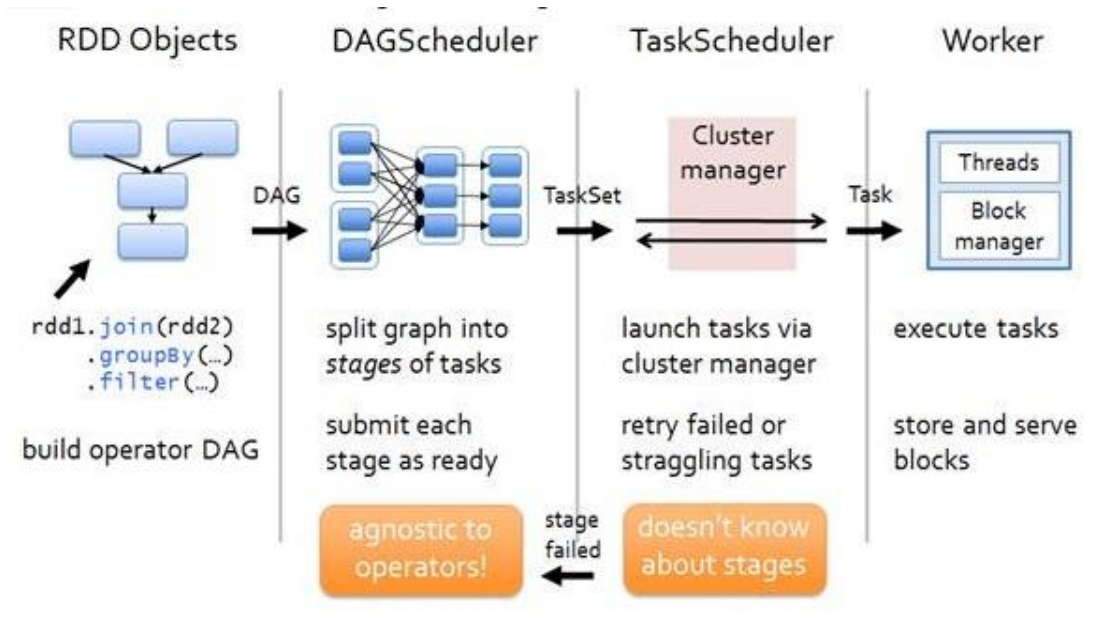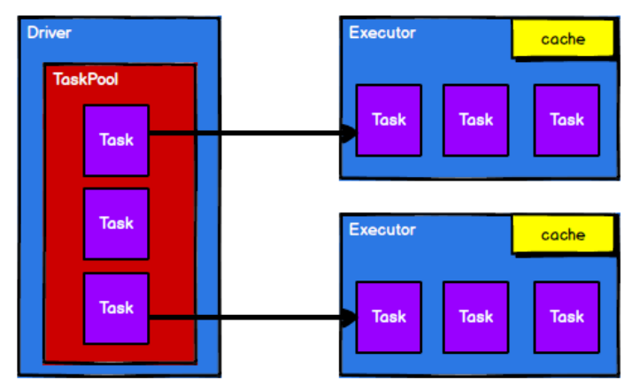 Spark 框架在执行时,先申请资源,然后将应用程序的数据处理逻辑分解成一个一个的计算任务。然后将任务发到已经分配资源的计算节点上, 按照指定的计算模型进行数据计算。最后得到计算结果。