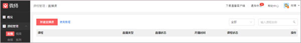 8、回到个人管理界面,下拉左侧的“课程管理”菜单,点击“直播”,再点击“新建直播课”;