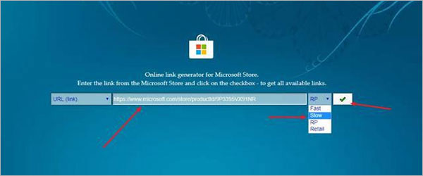 再打开浏览器,输入下面的网址:https://store.rg-adguard.net,之后把上面微软应用商店的链接粘贴进来,后面的选择Slow,再点击勾按钮;