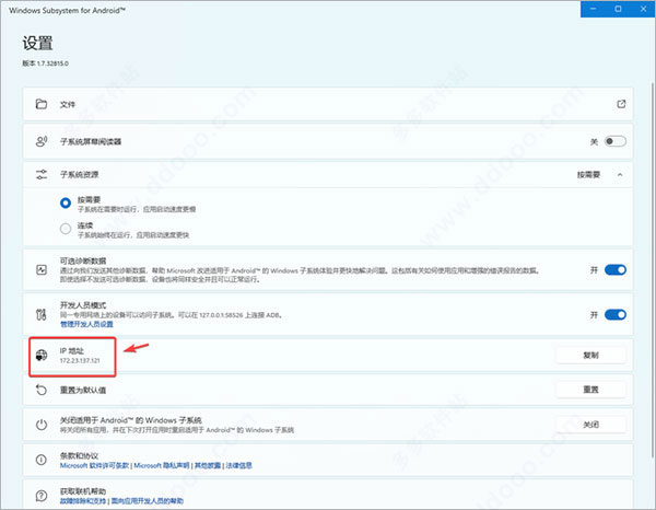 在WSA设置中,打开【开发人员模式】,就能看到IP地址。