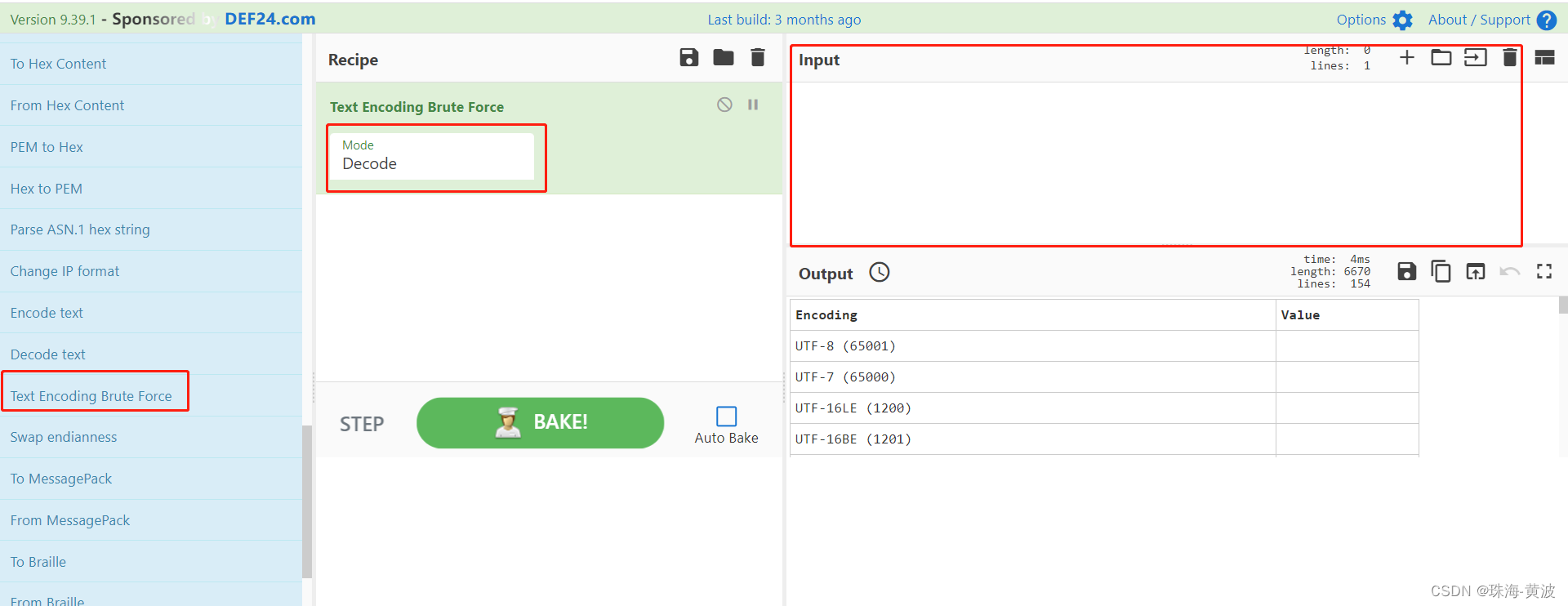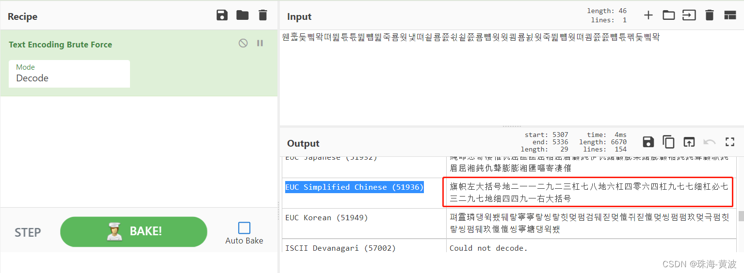 把韩文内容输入到右方Input 方框内 点击 BAKE! 进行暴力破解