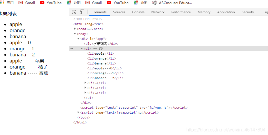 <li v-for='(item, index) in fruits'>{{item + '---' + index}}</li>
