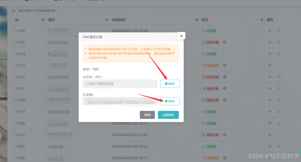 点击申请后,在申请记录处找到你刚申请证书的域名点击验证