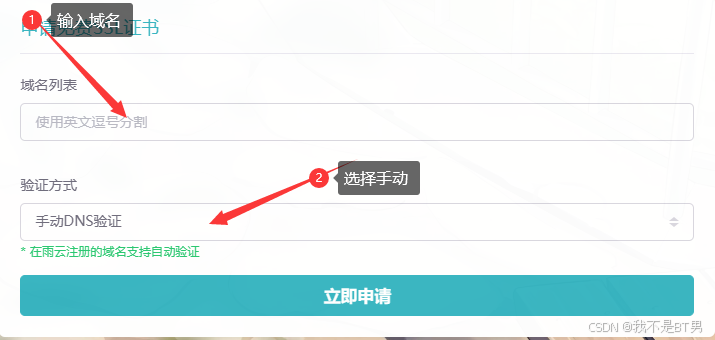 首先输入你要申请证书的域名,我个人感觉手动方便