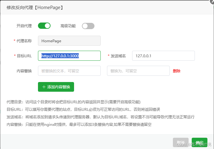 目标url就填:http://127.0.0.1:3000 ,发送域名就填:http://127.0.0.1,其他地方默认,点确定即可通过域名80端口访问