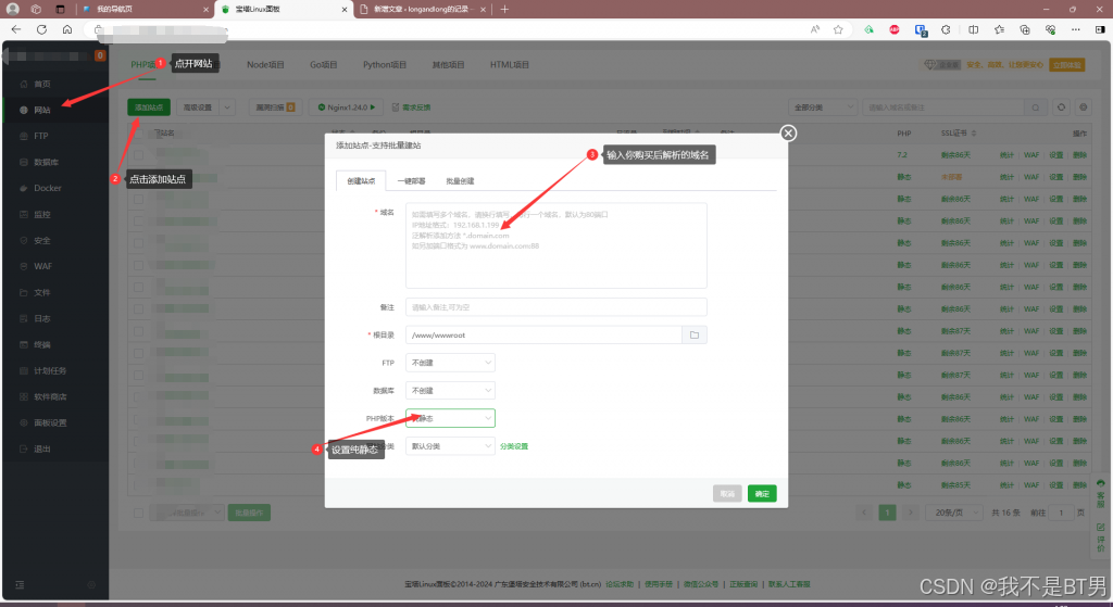 (1)新建网站,输入你购买后解析了的域名,php设置为纯静态,点确定