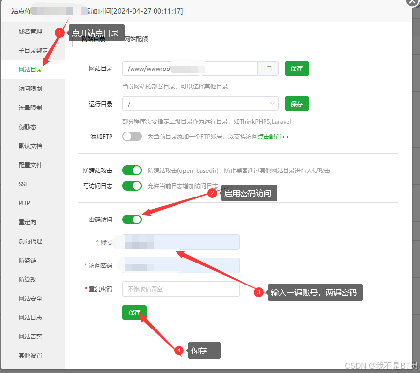 上面是我还不太熟悉宝塔的时候的操作,经过一天熟悉,我发现原来宝塔建站页面内置了给网页添加账号密码的地方,具体操作如下:
