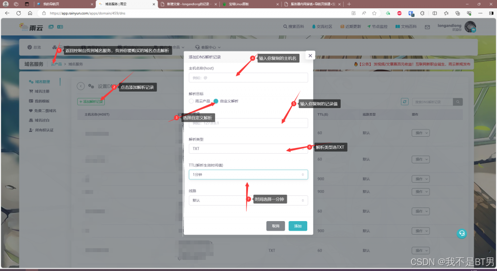 复制主机名和记录值,去域名解析处进行解析,点击添加
