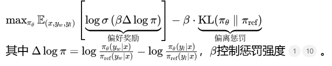 对比模型对优选/拒绝回答的概率差异,最大化人类偏好数据的似然,通过KL散度约束模型不要偏离参考模型太远