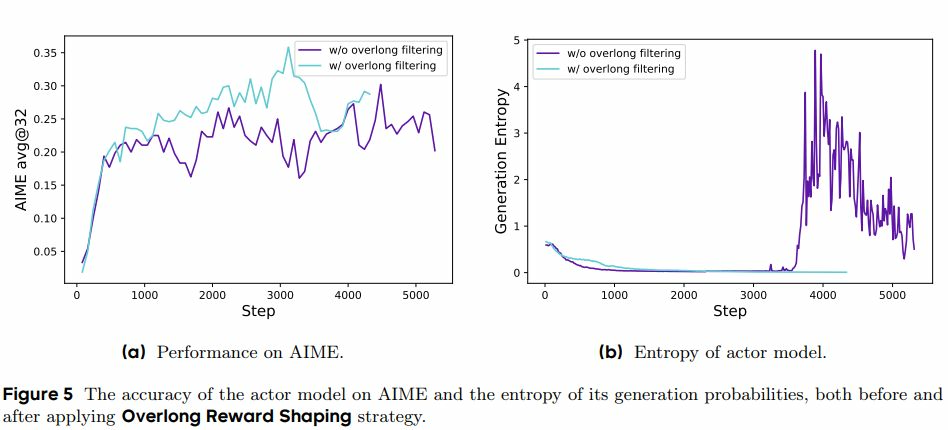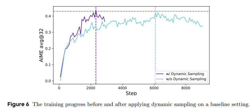 设置ϵ_low=0.2, ϵ_high=0.28。更高的ϵ_high为低概率token提供更多探索空间,防止熵崩溃;ϵ_low防止高概率动作被过度抑制