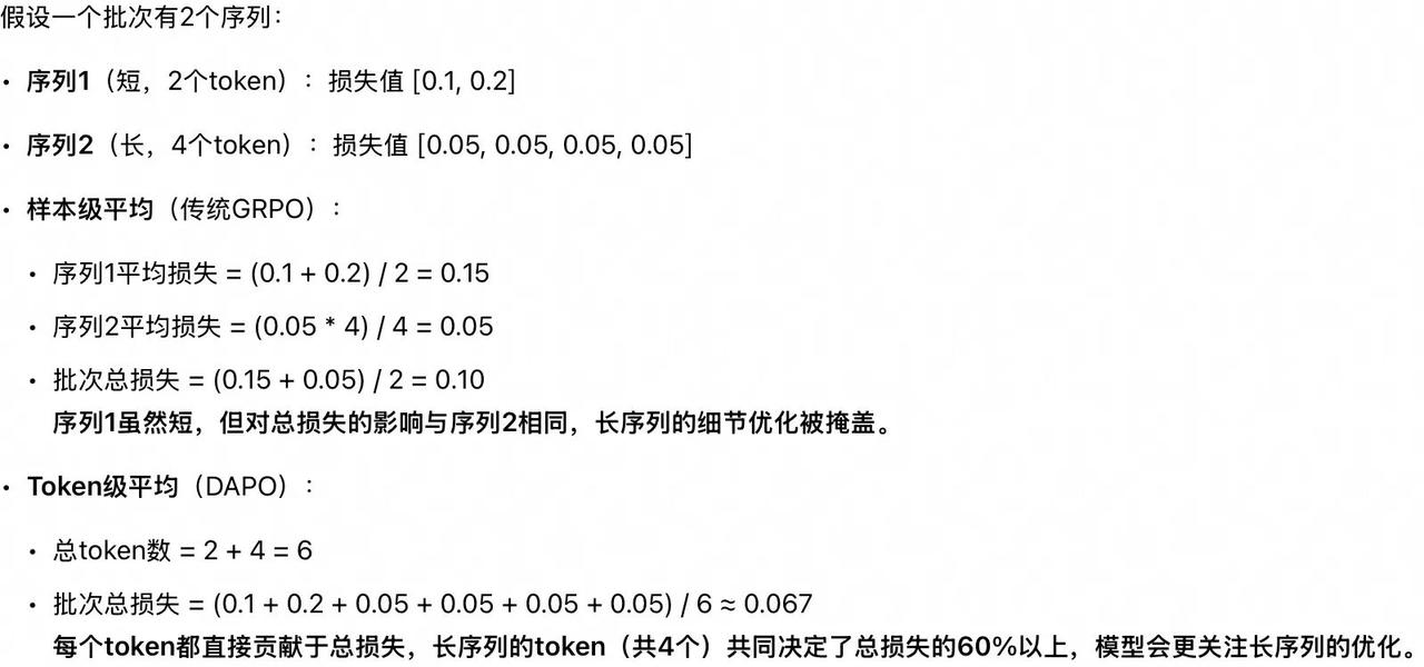 将PPO损失从序列级平均改为token级平均,确保每个token对损失的贡献均等(无论序列长短)。这增加长序列的优化权重,提升训练稳定性