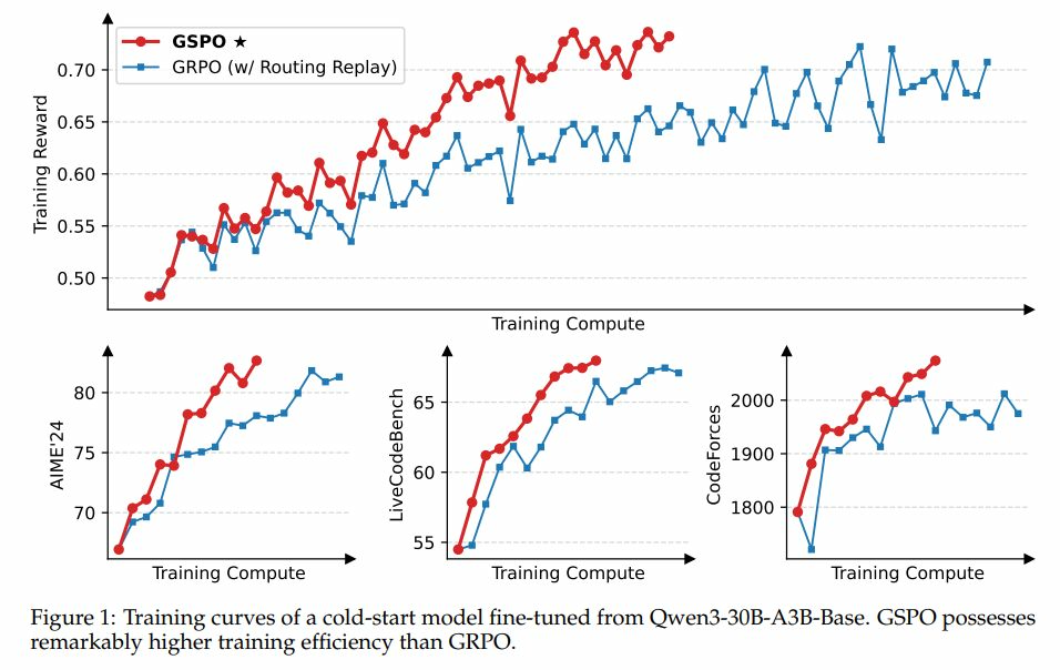 序列级权重计算对 MoE 模型中单 token 和专家激活变化不敏感,GSPO 能天然稳定地训练 MoE 模型,无需复杂的路由重放等稳定策略。不仅简化了训练流程,还释放了模型的全部容量。使用 GSPO 训练 MoE 模型不再需要路由重放技巧,从而消除了不必要的训练复杂性,并保留了 MoE 架构的全部潜力。